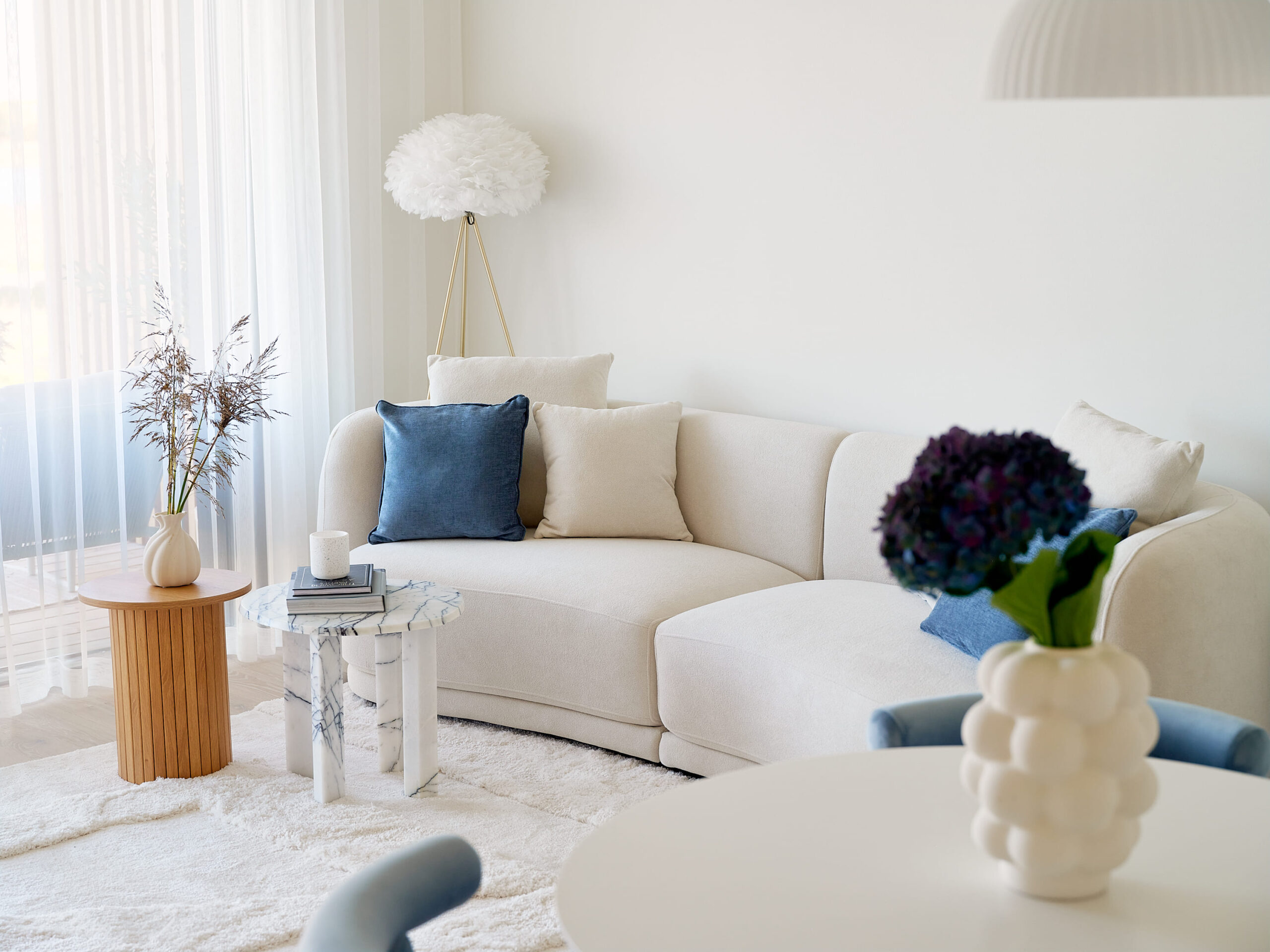 Sama pehme vormikeel jätkub ka muus pehmes mööblis ja valgustites. Kumerad jooned toovad interjööri pehmust ja elegantsust. Eriliseks aktsendiks on põrandalamp, mille vari koosneb rohketest valgetest sulgedest – detail, mis lisab ruumi kerge teatraalsuse ja ootamatuse.